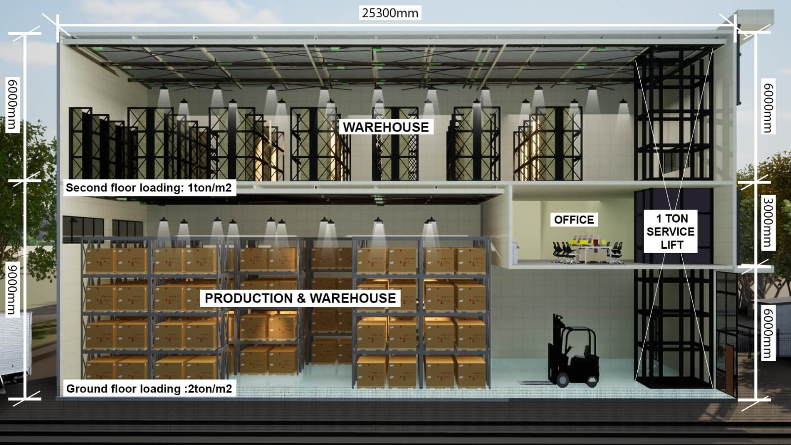 Product Spec1 ton Service Lift, 250 Amp Power Supply, Stainless Steel Gutter, Concrete Driveway, Ground Floor Loading : 2ton/m², Second Floor Loading: 1ton/m²
